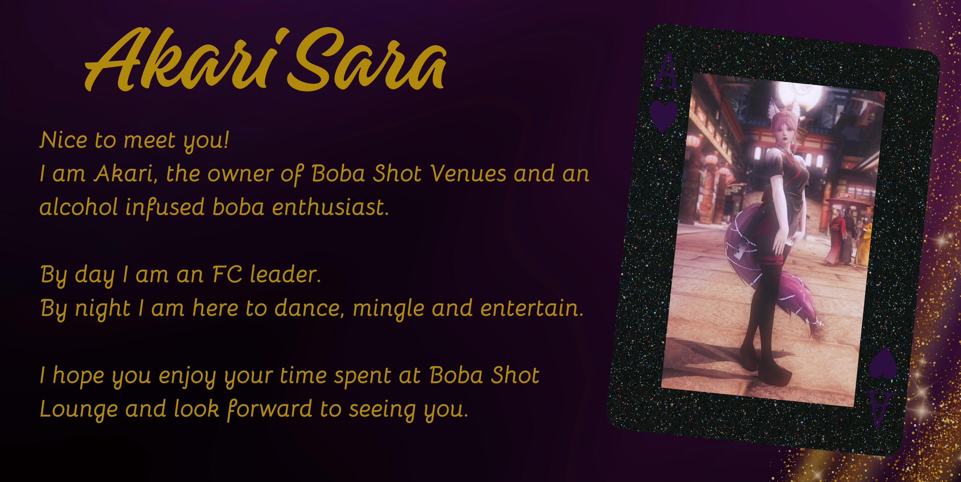 Boba Shot Lounge is an FC owned Venue held at our second FC house. We specialise in alcohol infused Boba and a FFXIV themed menu. We also host Café Enchanté at our main FC house here in Couerl! We have a third venue opening later this year at our sister FC! Our venue will entertain you with dancers, courtesans, private hire staff, gambling and a place to help you unwind after a long day in our baths!